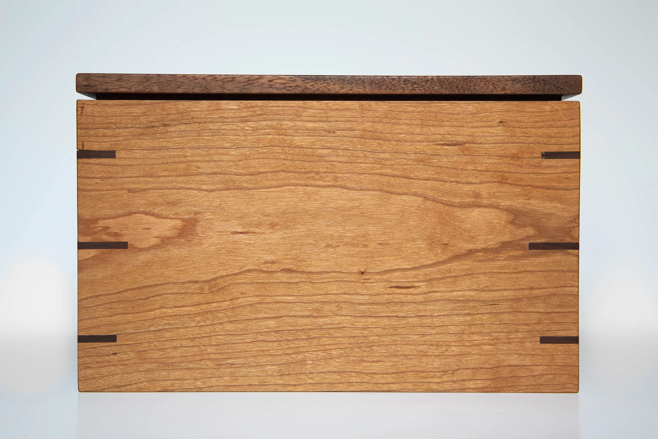 This box is made from cherry and black walnut. The grain flows around the mitered corners which are reinforced with keys, and the lid is double-routed for a floating effect. Finished with Odie’s Oil.