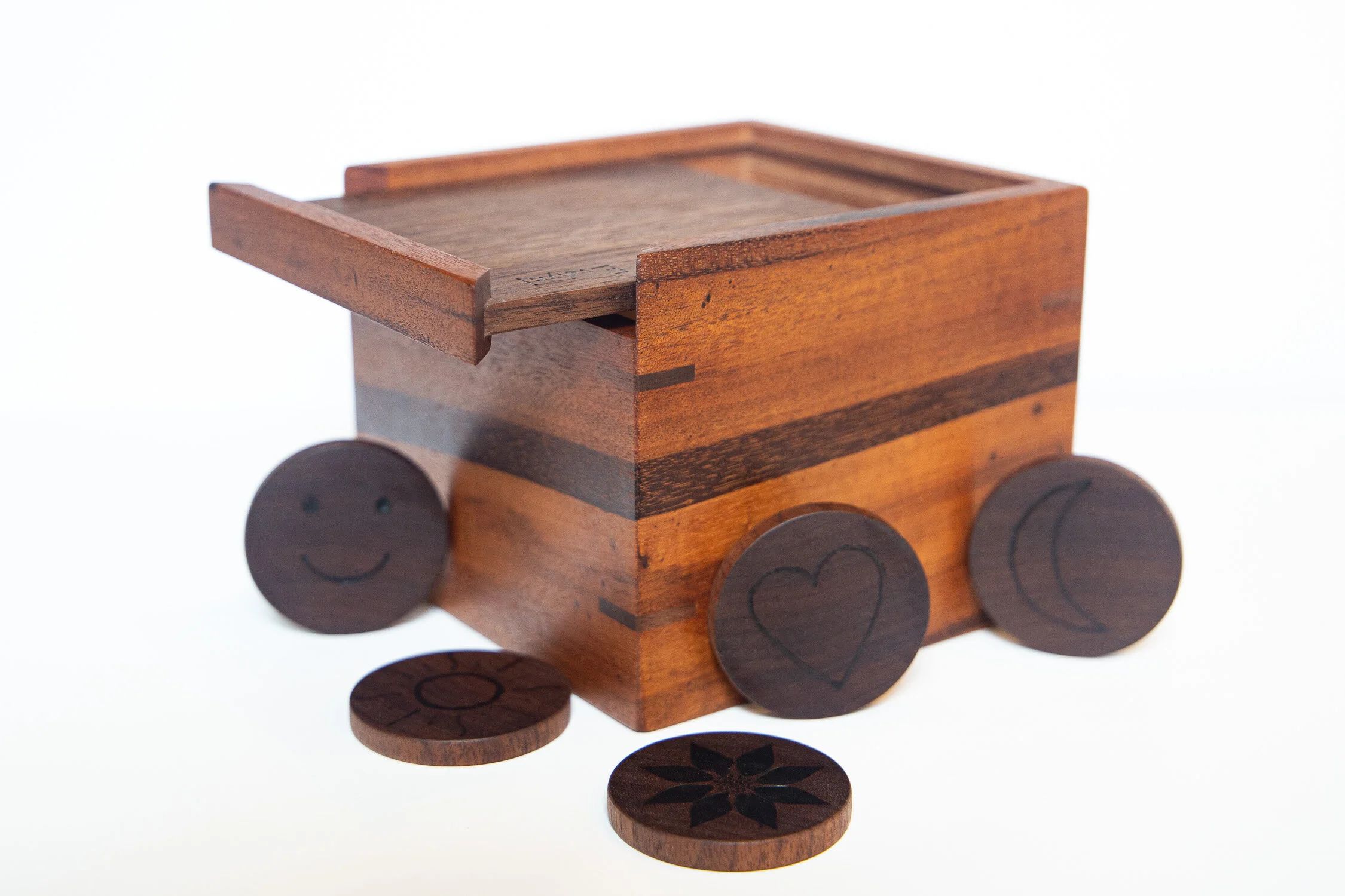 This box is a gift for a special someone made of goncalo alves (tiger wood) and black walnut, with burned walnut coins. It has a slot in the top and a secret sliding bottom. The prominent dark stripe is part of the wood and wraps around the keyed, mitered corners. Finished with all-natural, food-safe Odie’s Oil.